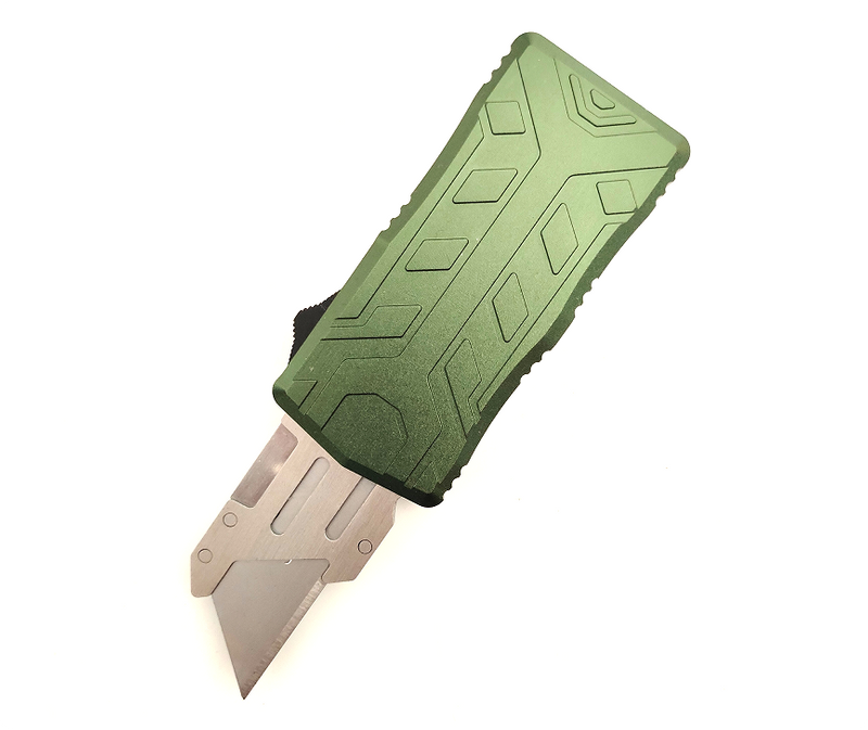 4. Dual action OTF, standard refillable utility blades, anodized aluminum handle.