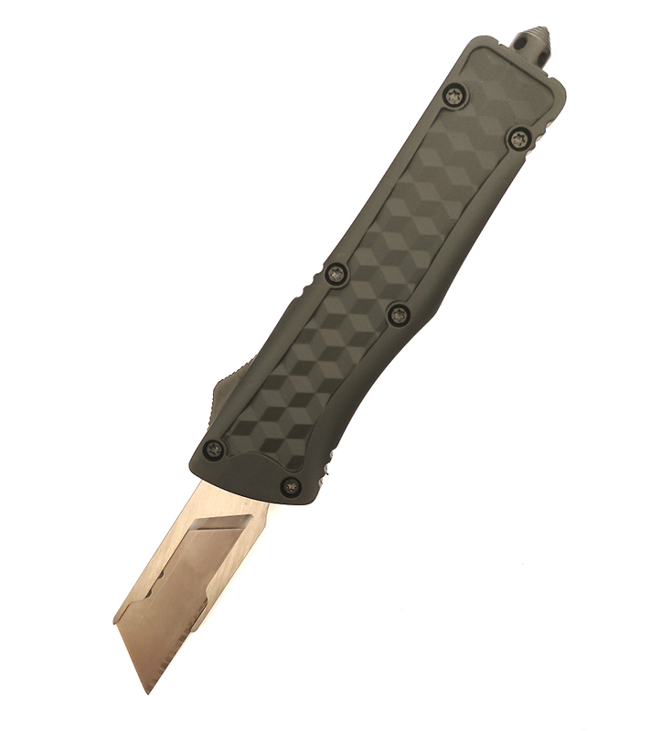 4. Dual action OTF, standard refillable utility blades, zinc alloy handle with rubber and plastic covered.